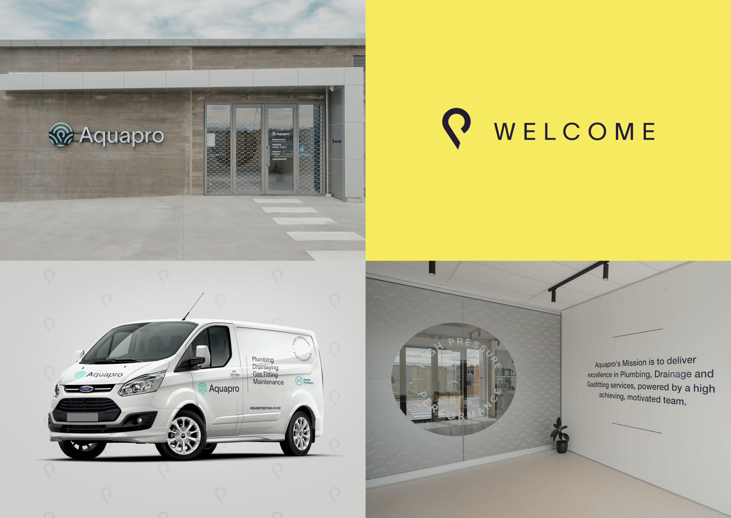 The rollout of the new Aquapro brand coincided with their move to a new office, so the new brand assets were brought to life through signage around their space.
